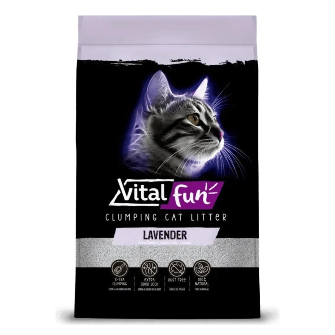 VITALFUN LAVANDA es bentonita natural desarrollada mediante una molienda especial que potencia la aglomeración al contacto con la orina y las heces del gato formando grumos sólidos que son fáciles de retirar.