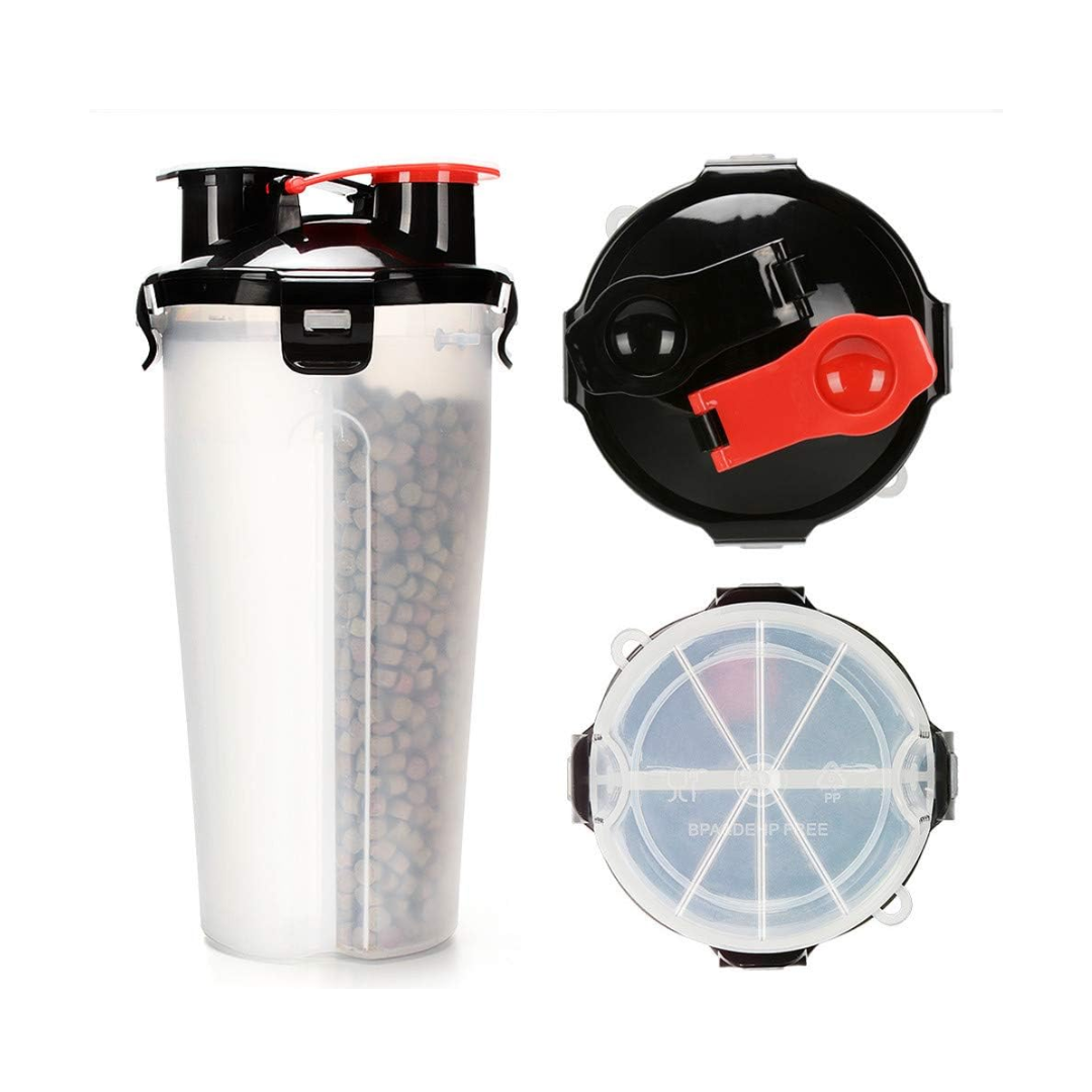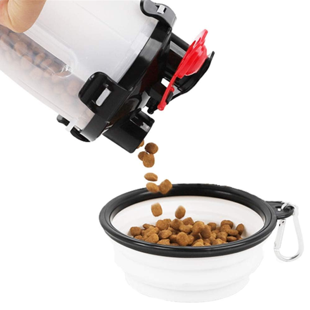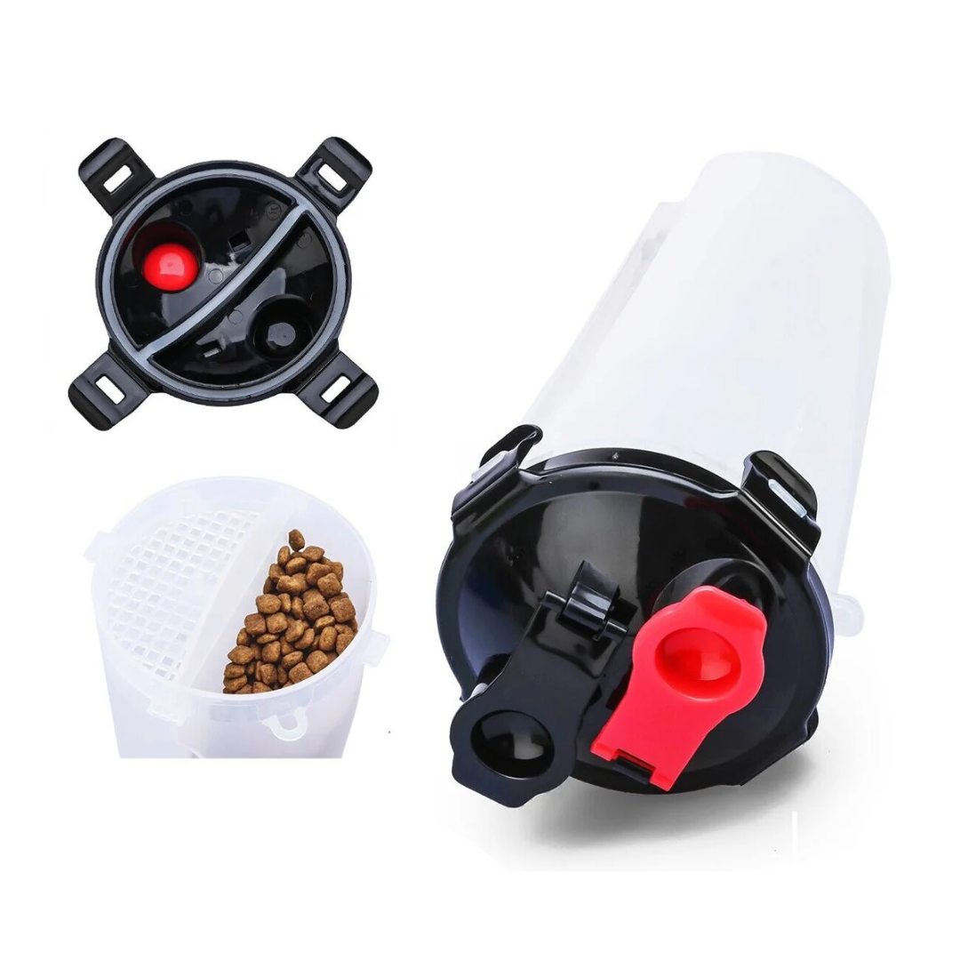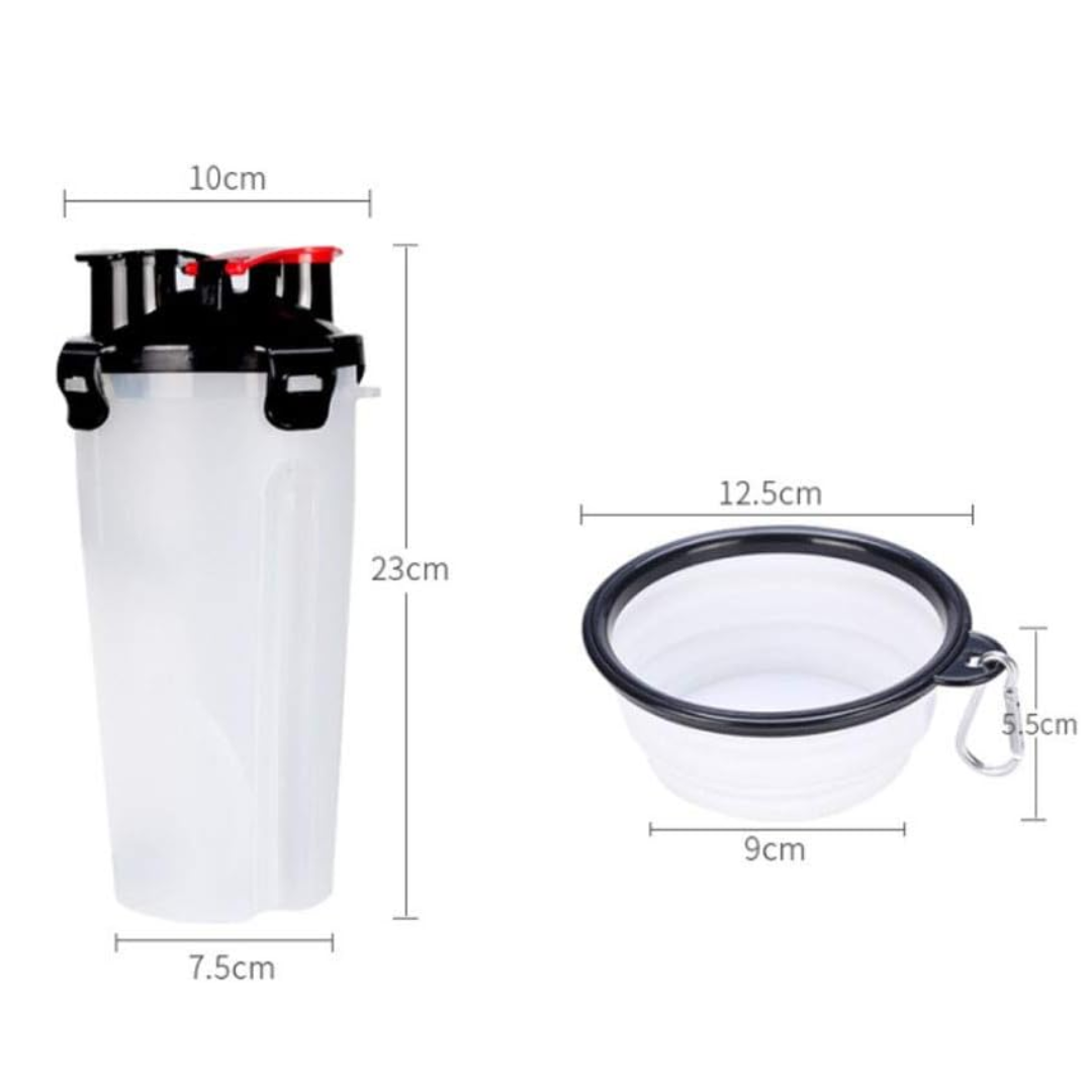 Se trata de un contenedor portátil doble -de agua y comida- con un plato plegable de silicona. En uno de sus compartimentos puede llevar hasta 350 ml de agua y en el otro 210 gramos de alimento. Está fabricado en material plástico y siicona. Cuenta con un cierre hermético que impide el paso del aire y el derrame de agua.