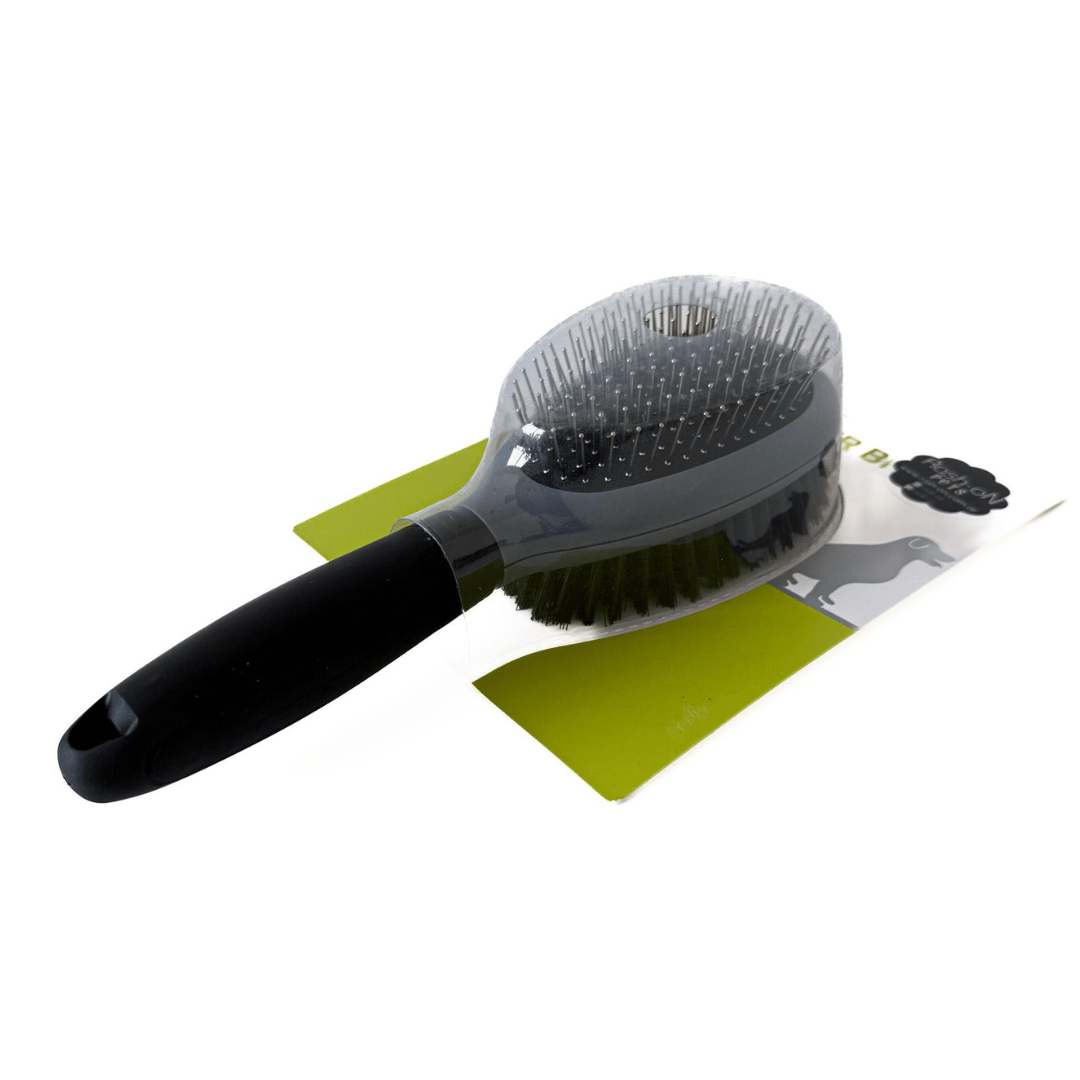 El CEPILLO DOBLE CARA es una herramienta universal para el cuidado del pelaje de perros y gatos. La primera cara cuenta con puntas metálicas rematadas con bolas protectoras que peinan suavemente el pelaje, eliminan el pelo suelto y masajean la piel. La segunda cara, con cerdas de nylon, es ideal para alisar el pelaje y eliminar el polvo y la suciedad fina. El cepillo favorece la salud del pelaje y estimula la circulación sanguínea. El mango ergonómico con acabado antideslizante garantiza una sujeción cómoda incluso durante el cuidado prolongado.