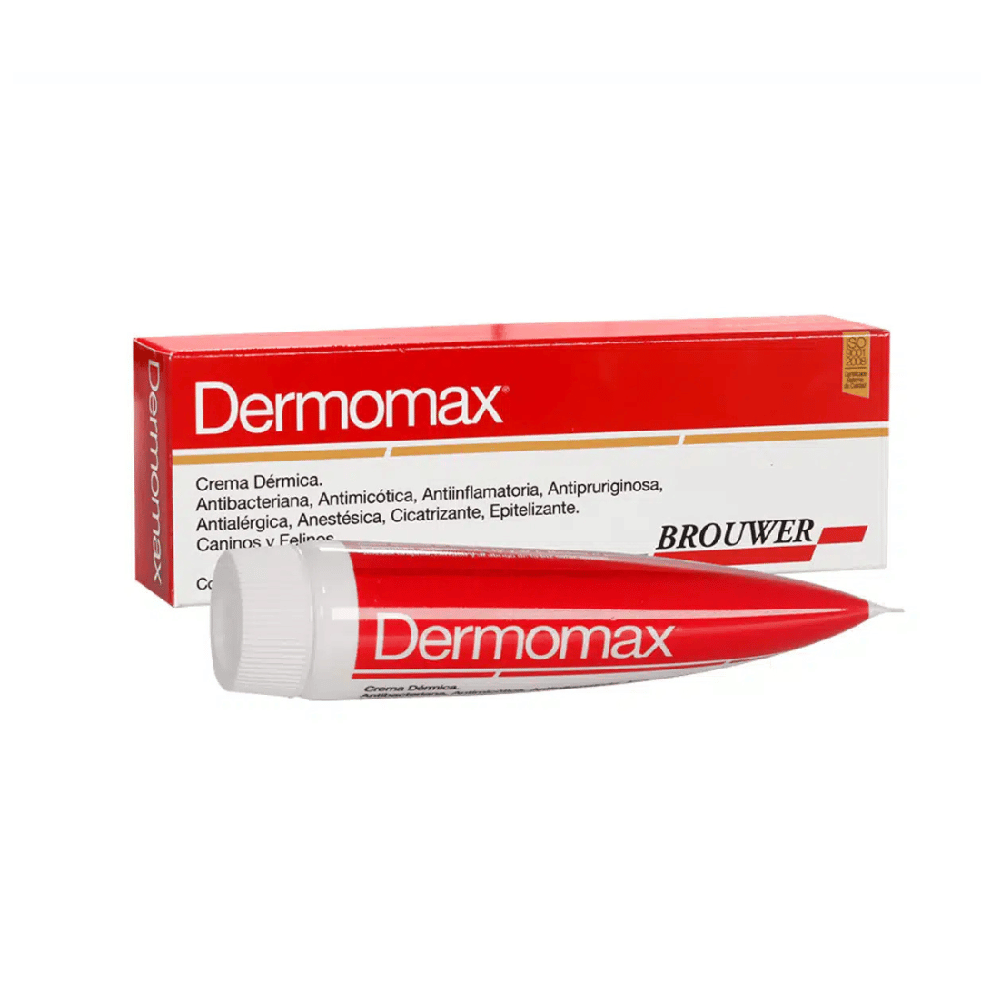 La CREMA DERMOMAX es una crema dermatológica veterinaria de amplio espectro, formulada por Brouwer para perros y gatos. Combina antibiótico (gentamicina), antimicótico (clotrimazol), antiinflamatorio (betametasona), anestésico (lidocaína) y vitamina A para tratar infecciones, alergias, dolor e inflamación en la piel, facilitando la cicatrización.