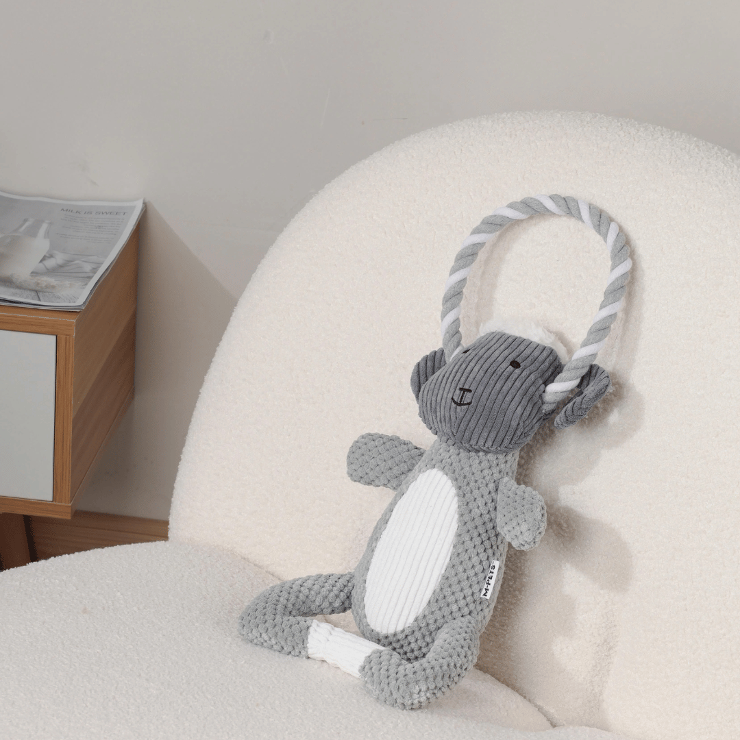Está fabricado con materiales resistentes, poliéster reciclado y otros materiales duraderos, ideal para juegos intensos. Incluye un chifle interno que emite sonidos al presionarlo, estimulando el juego y la atención de tu mascota. Es perfecto para juegos de masticar, tirar y buscar, promoviendo el ejercicio y reduciendo el estrés.