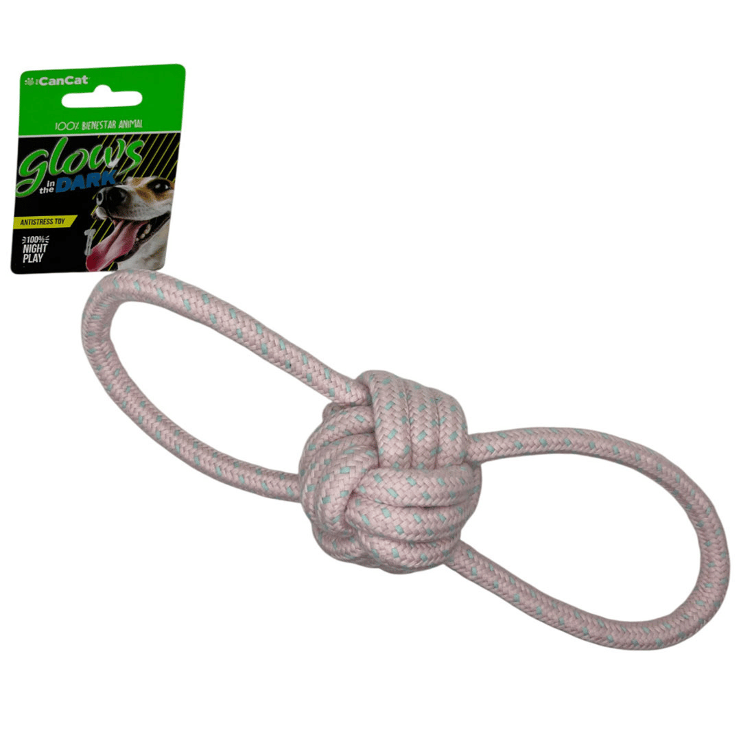 La SOGA 2 ANILLOS GLOW IN THE DARK CANCAT es un juguete para perros  cuya soga incorpora materiales fosforescentes que permiten su visibilidad en condiciones de baja luz. Tiene un diseño que la hace fácil de transportar y manipular.